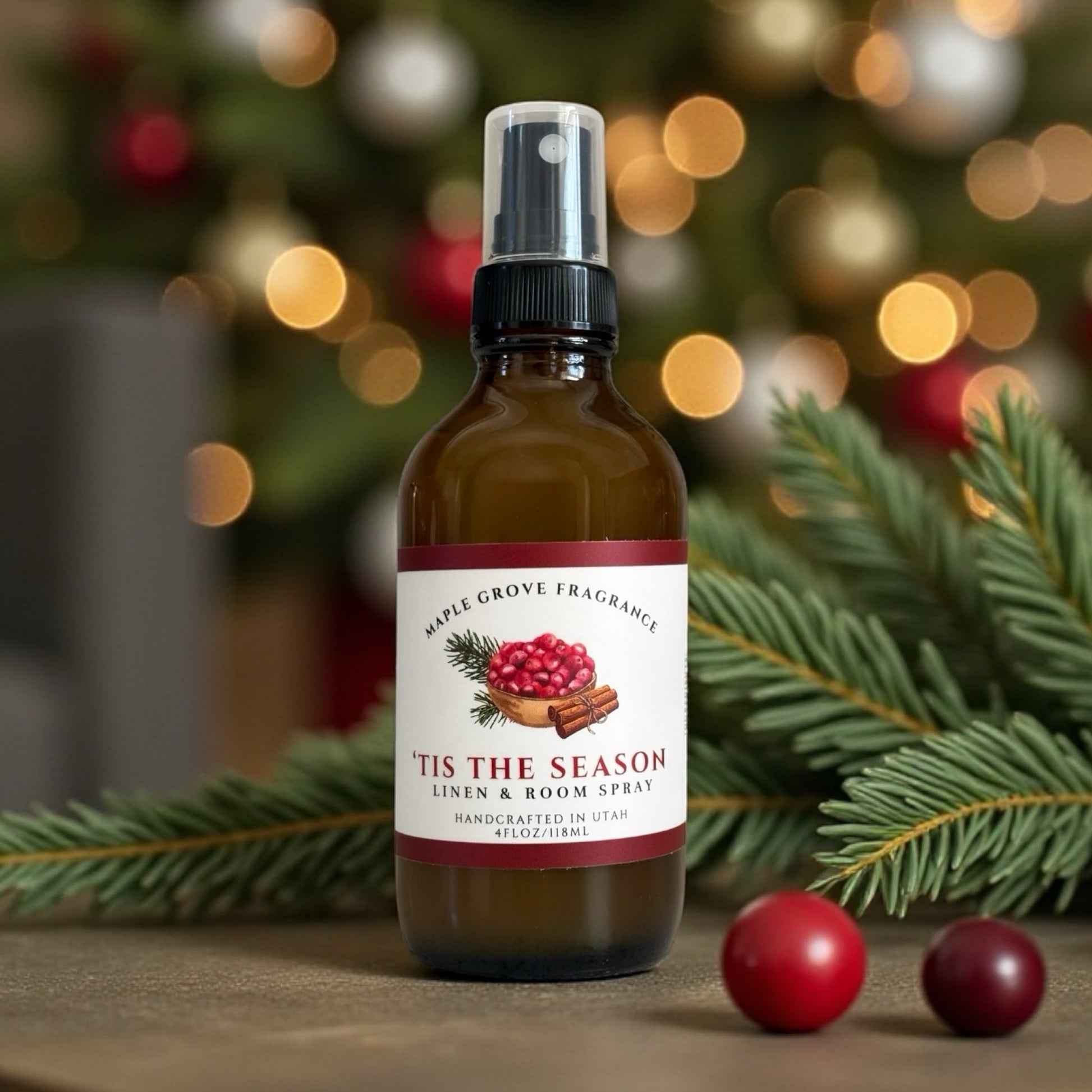 This room + linen spray packs a joyful punch — bright red currant and tart cranberries bringing the sparkle, cozy cinnamon and clove turning up the warmth, and a hint of fir and pine reminding you that the holidays belong to tradition. It’s fruity, it’s spicy, and it’s basically Christmas bottled up and ready to spritz.